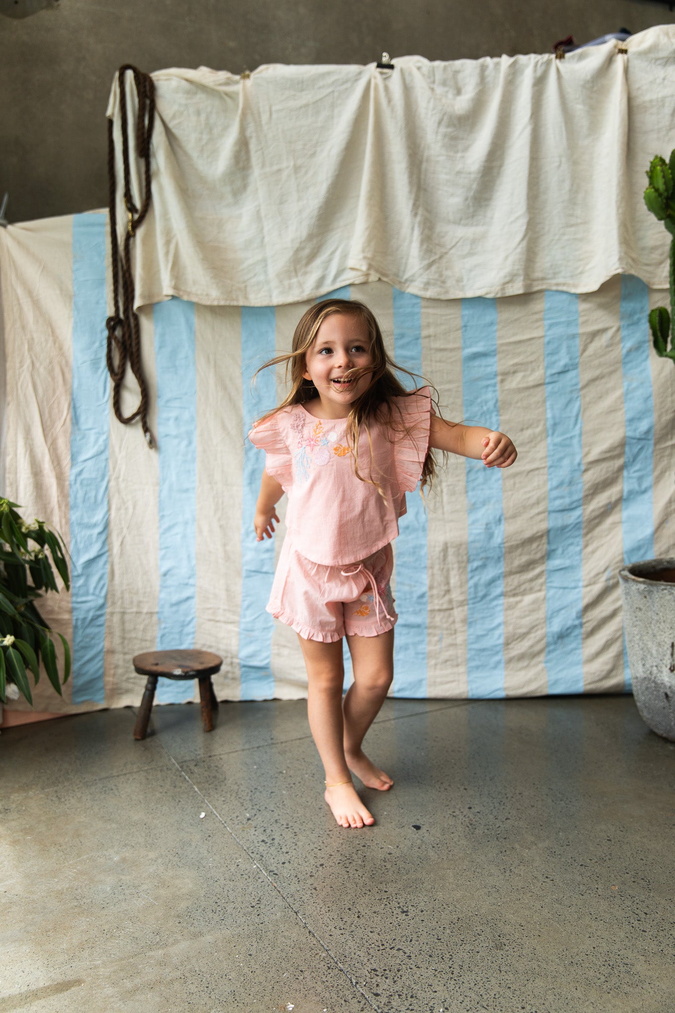 Gia shorts are your go-to easy-wear option, with a comfy stretchy waistband and a sweet ruffle hem. Playful ties and pretty embroidery add a fun, unique touch. These are sure to be on high rotation this summer. Made from 100% Cotton.