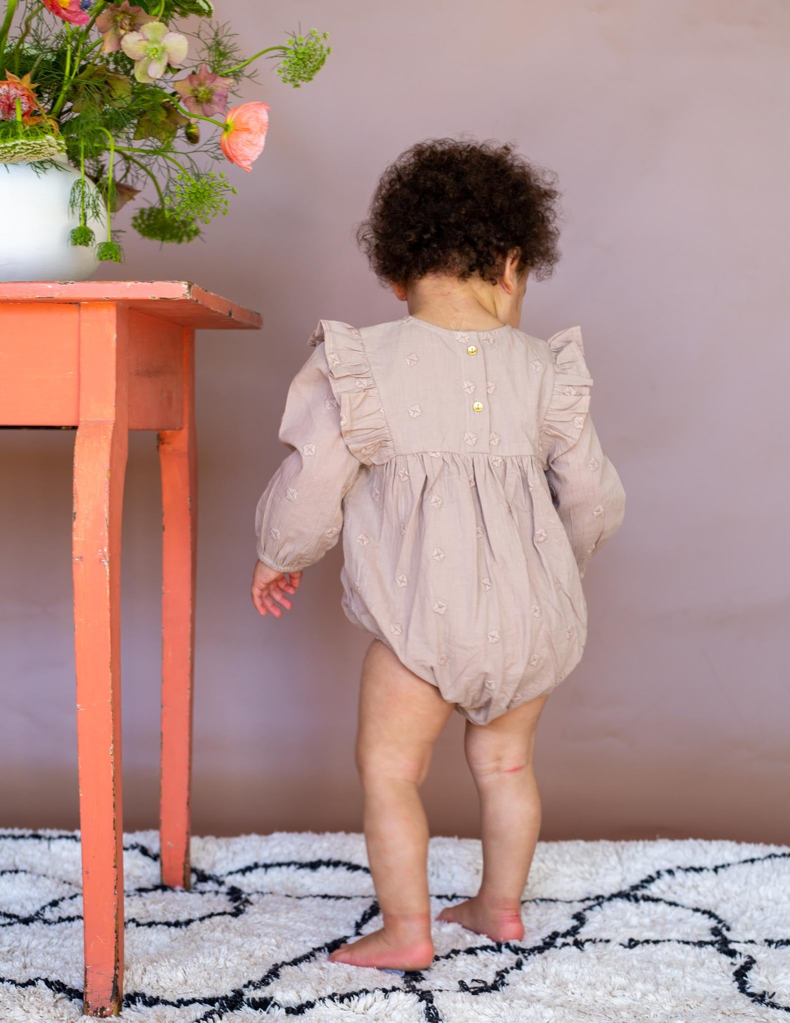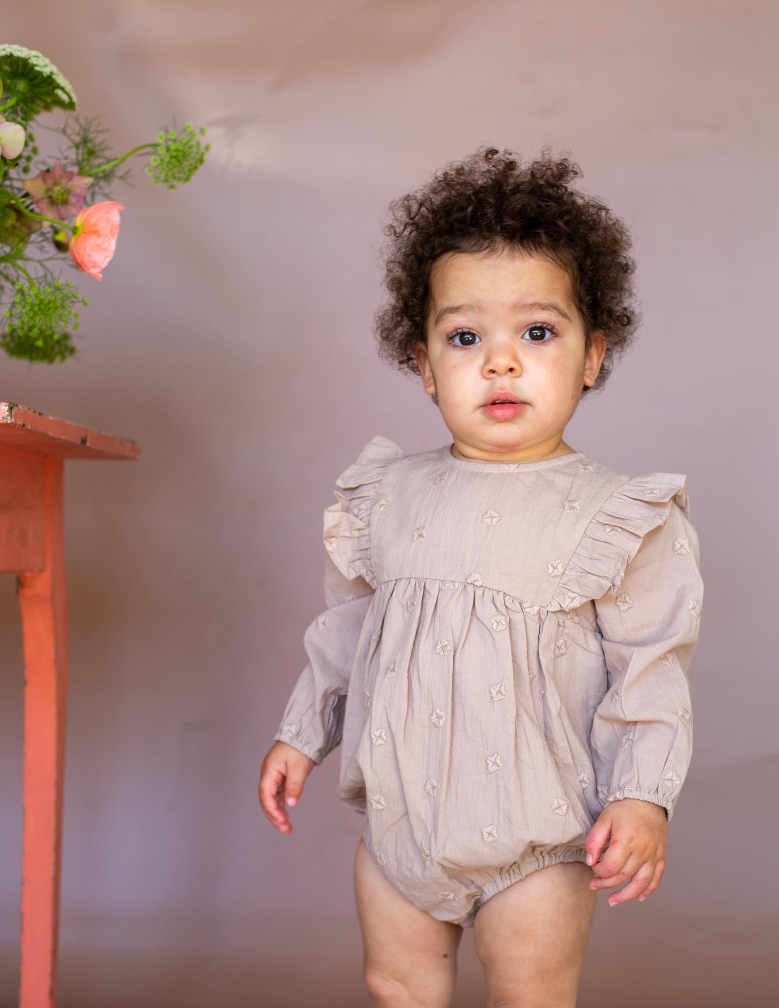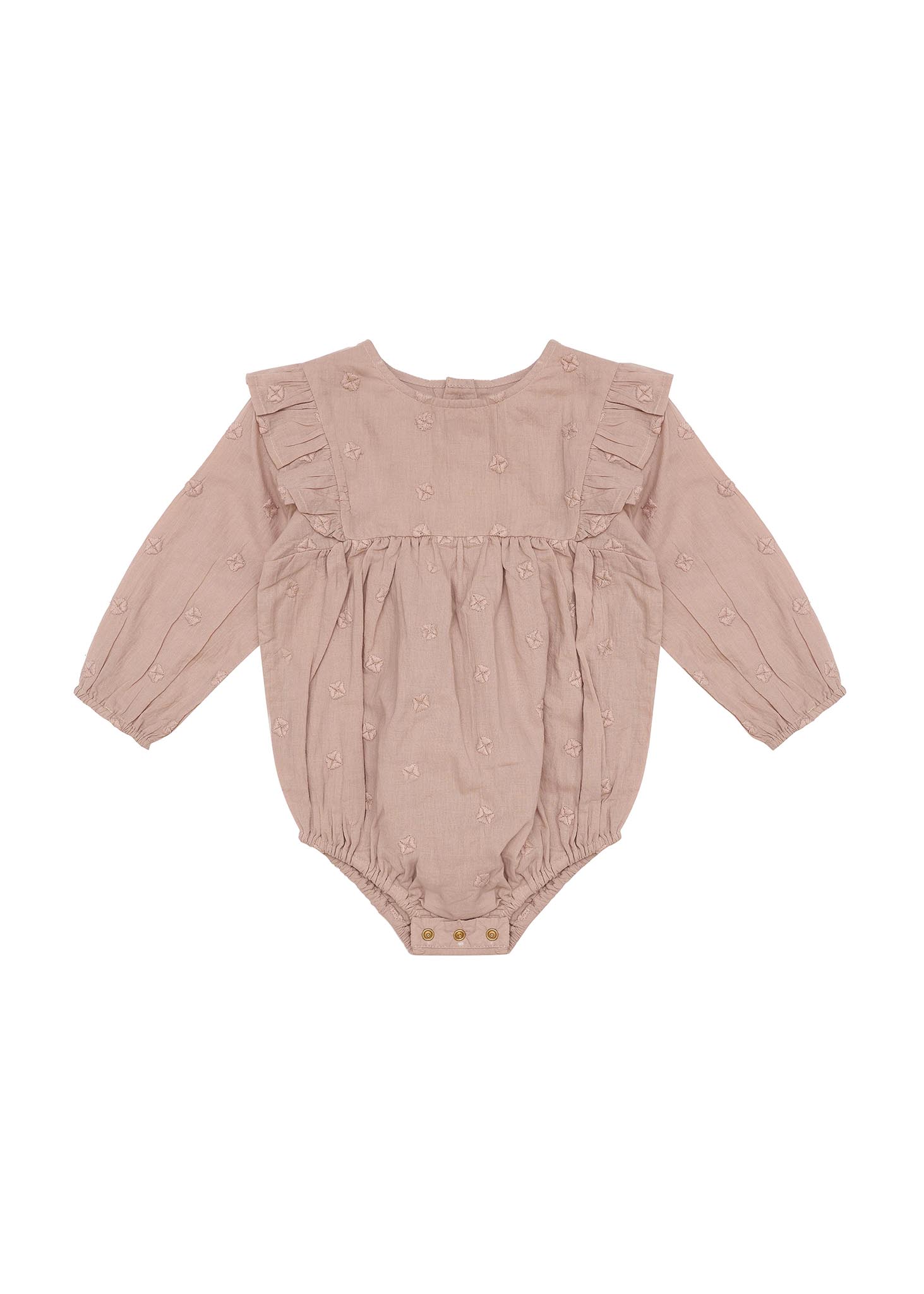 The Jessy Romper is a sweet little baby romper with long blouson sleeves and beautiful all over embroidery. It is soft cotton with soft elastic around the wrists and leg openings, gold buttons down the back and snap closures for easy changing. In a beautiful neutral shade this piece is sure to become a firm favourite.