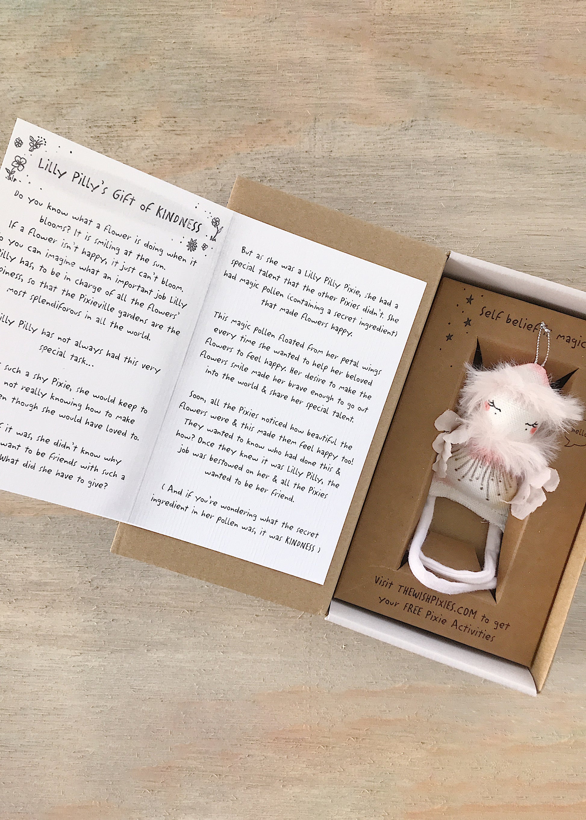 For some additional magic, the doll also has a little pocket on its back that contains a secret spell. Once read, this begins the magic of self belief inside the child. The pocket can also be used to leave or give messages, to and from the Pixies.