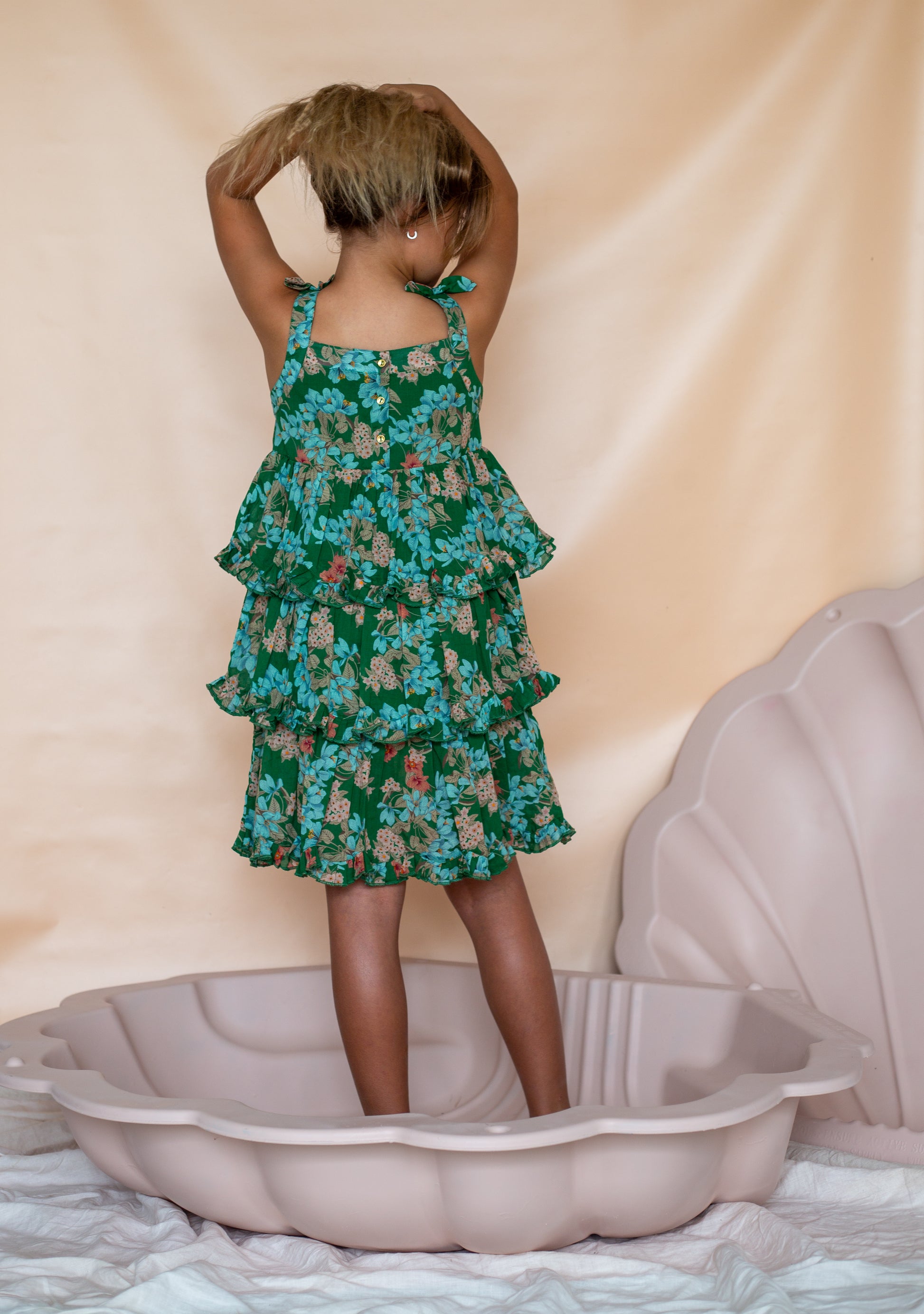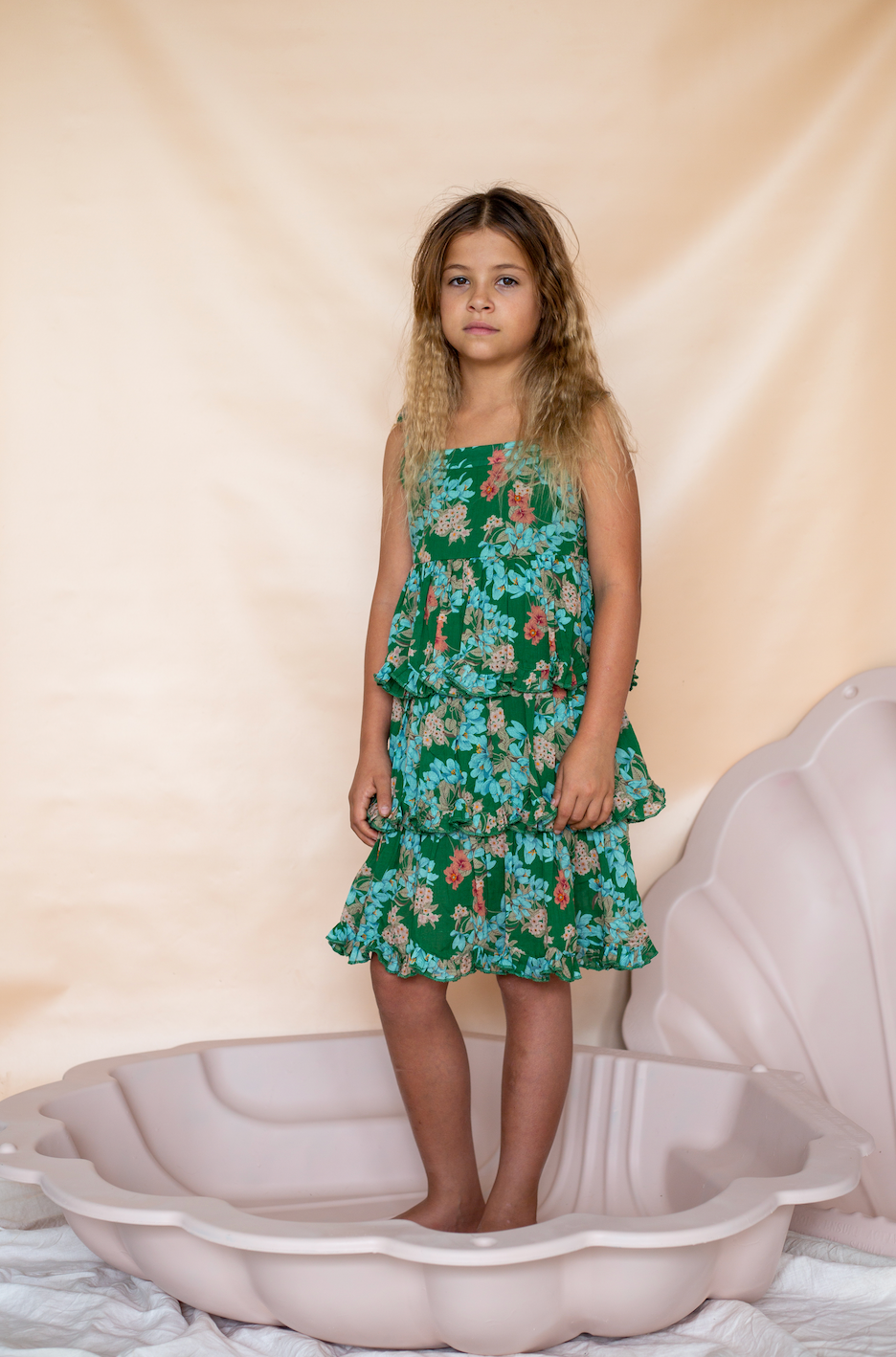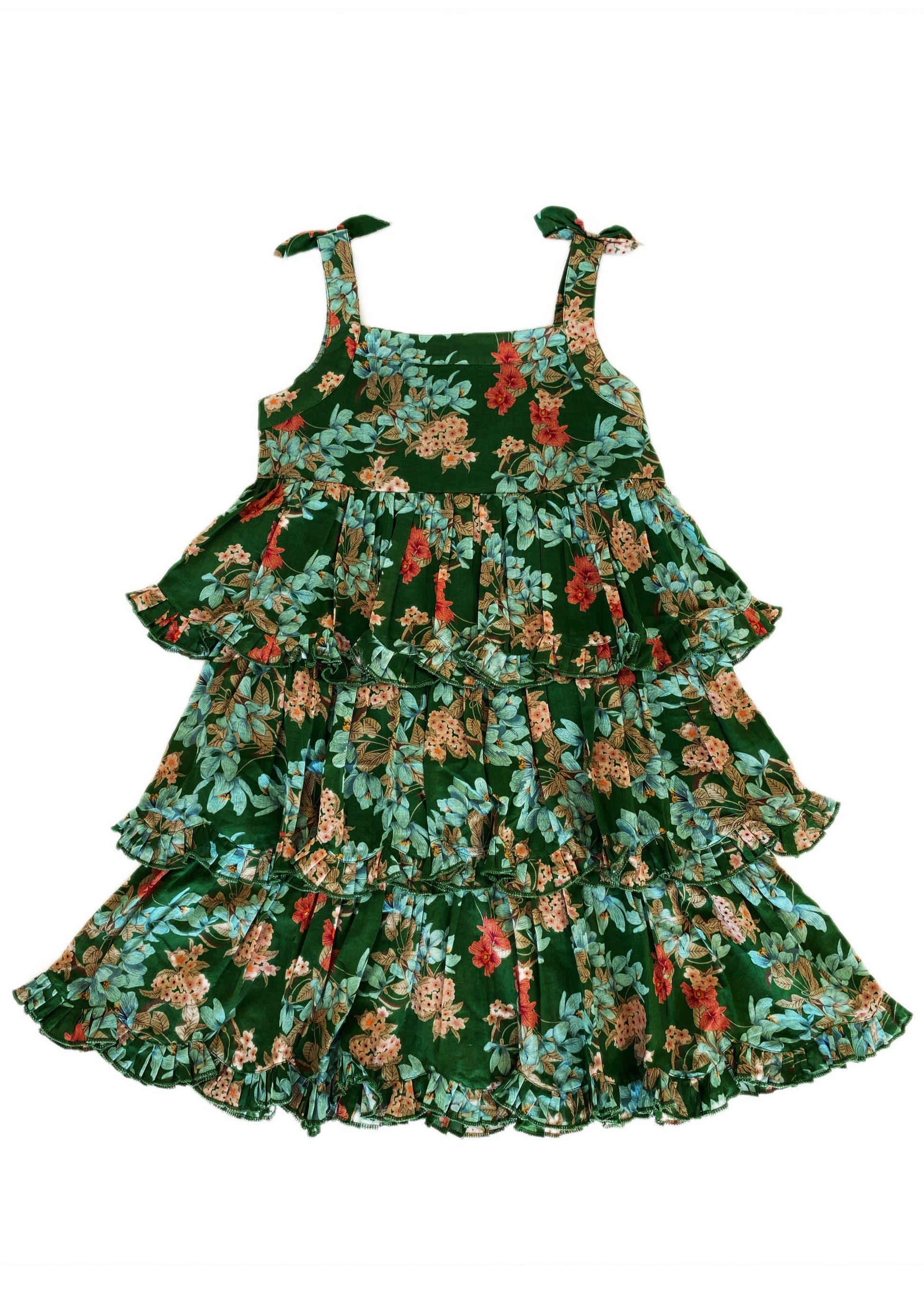 Ruffles on ruffles and scalloped hems, Madeline was made for twirling. Madeline is made of 100% cotton voile and is fully lined, knee length with shoulder bow detail and is pretty as a picture.