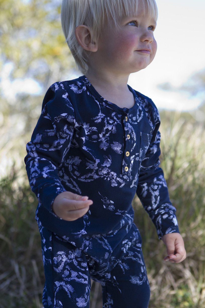 A gorgeous long sleeve baby romper with buttons down the front, a patch pocket and a snap crotch for easy changing. A full length, snuggly one piece for cool Winter days. Made with 100% Cotton in our 'Serpent' snake print.