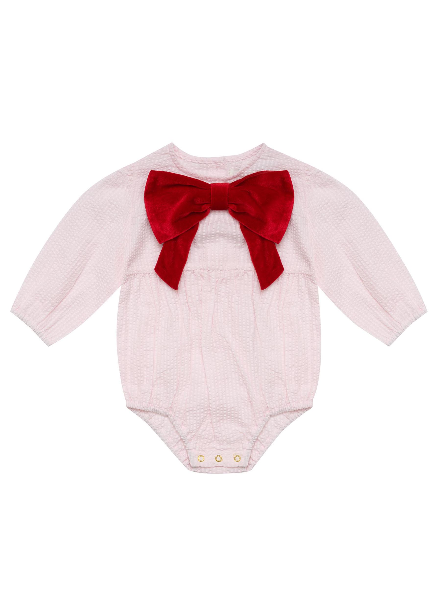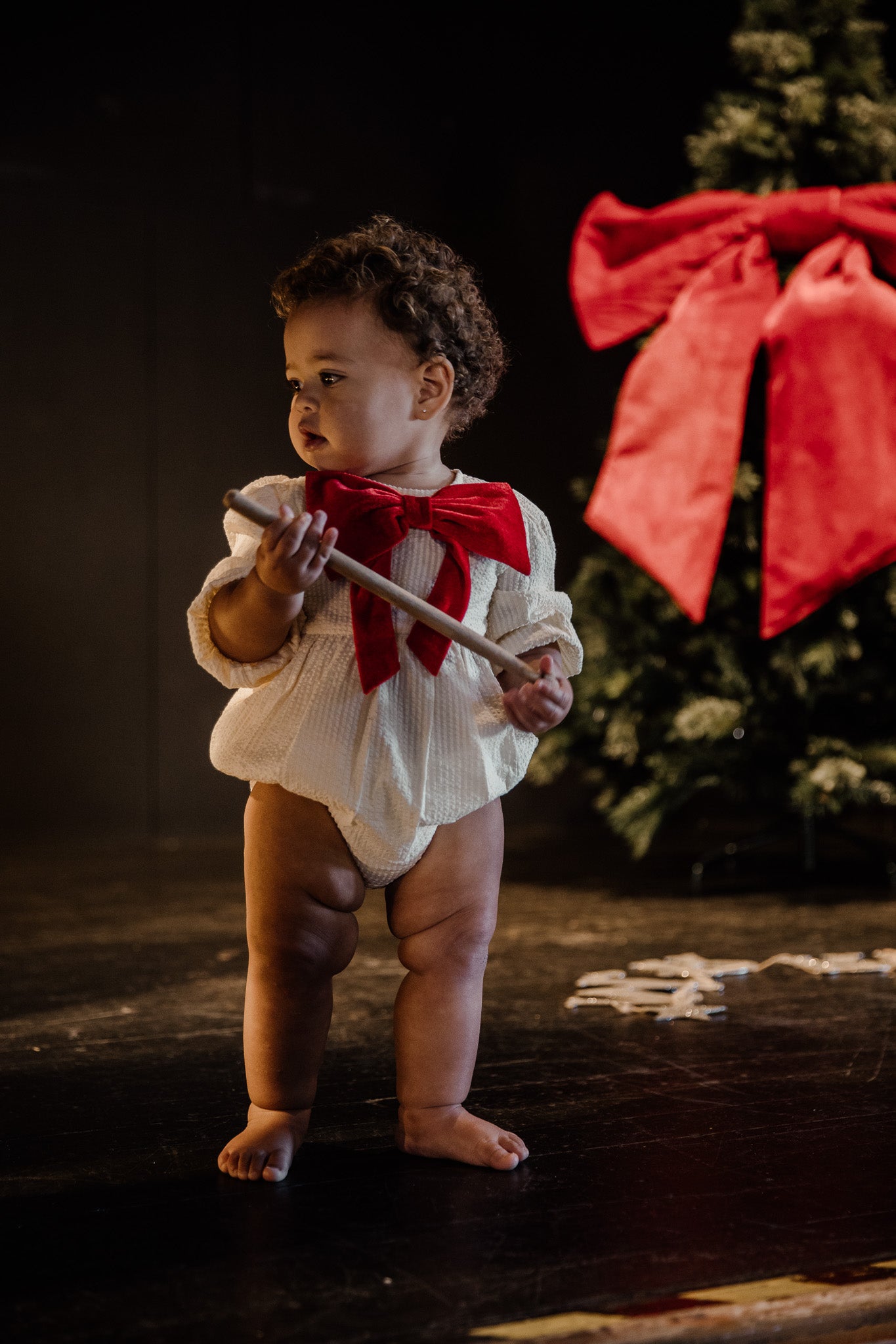 The cutest little romper for Christmas day, photos or anytime of the year. The Pudding romper features our rich red bow with puff sleeve and snap crutch.