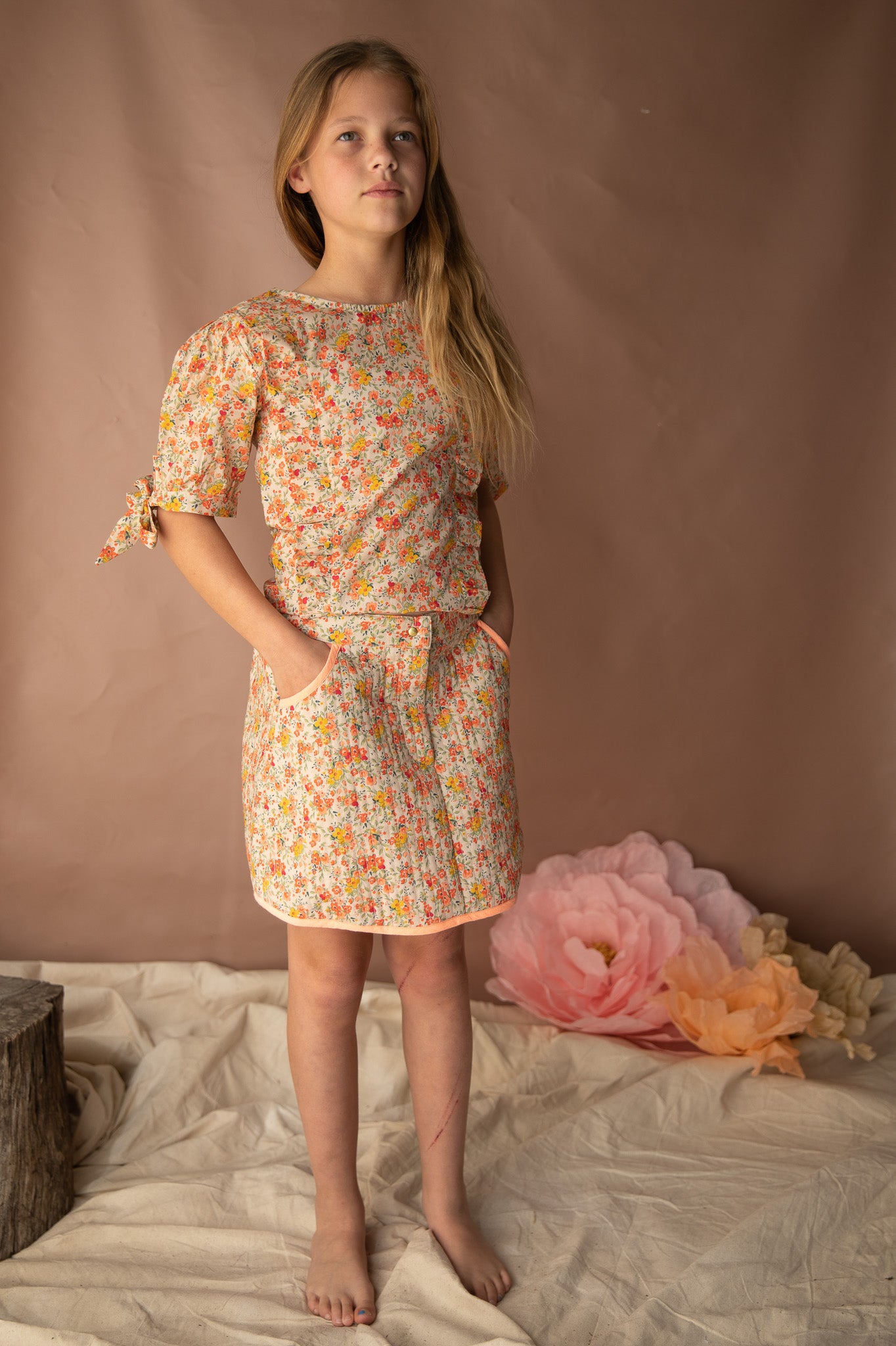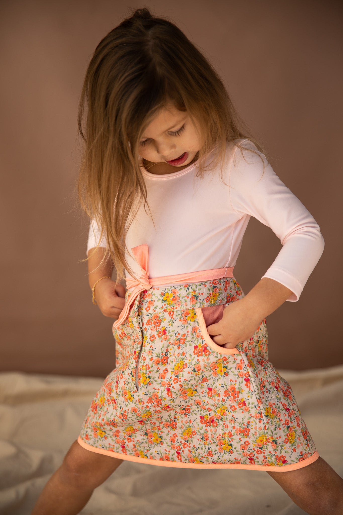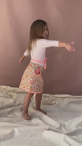 Quilted and fully lined, Robin is perfectly finished with fluro trim, and exposed pockets in the sweetest peach contrasting fabric, topped off with zip front and gold button fastening. The perfect winter skirt, you can layer her up with our matching Kingfisher top or Jaybird jumper for a flawless pattern match.