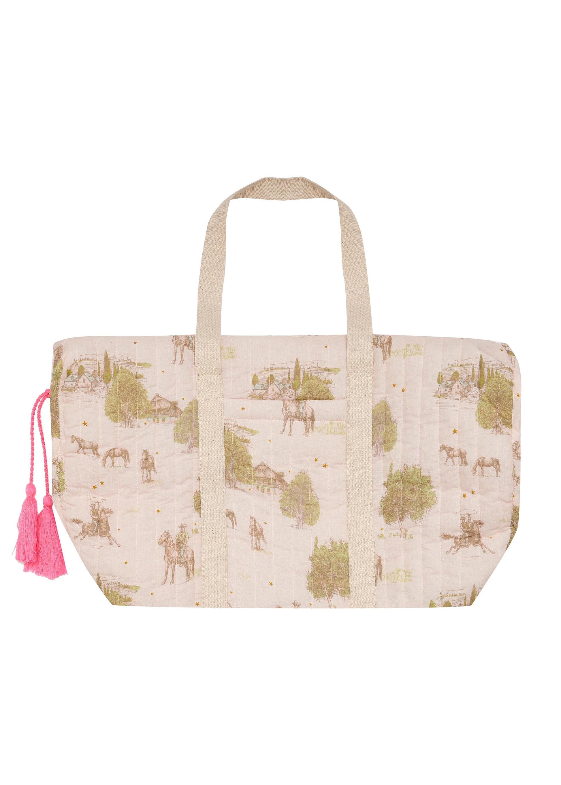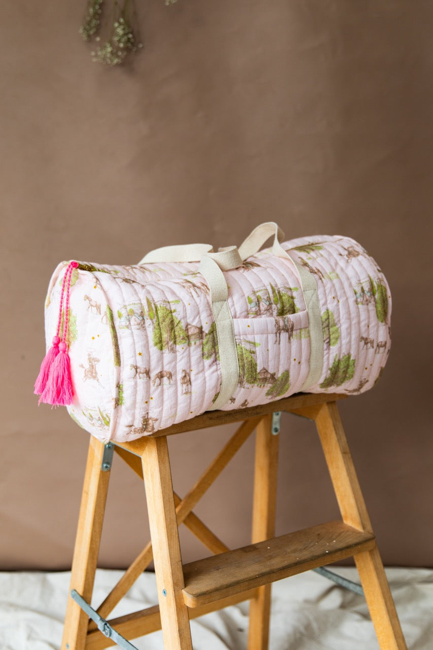 Quilted and lined in soft cotton voile finished with a neon pink tassel, gold YKK zipper and cotton canvas shoulder strap. Slumber parties never looked so beautiful. For my things vanity bag also available in matching print.