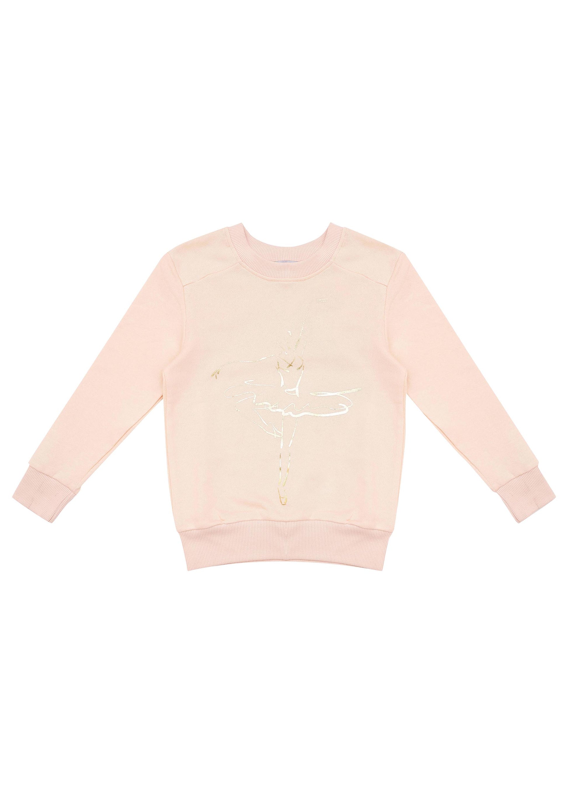 Soft French Terry, featuring our gold foil ballerina sketch and finished with matching ribbed collar and cuffs. The dance class ready colour-way and easy pop over style are sure to make this a favourite. Layer it up with a classic Bella & Lace tutu and knit leggings or pop over a Vintage ballerina for an edgy mix.